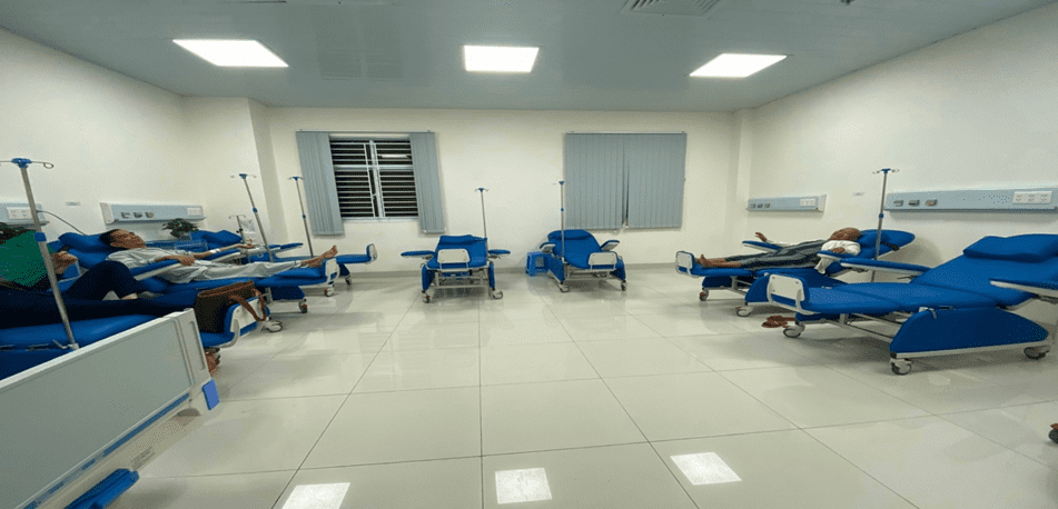 - Máy móc và trang thiết bị, bao gồm: Ghế truyền hoá chất: 20 ghế, máy hút đờm, máy theo dõi các chỉ số sinh tồn (monitor), bơm tiêm điện, máy đếm giọt, bộ dụng cụ cấp cứu, bình oxy lưu động, bộ đặt nội khí quản, máy siêu âm và hệ thống máy phục vụ đốt u gan, đốt giáp…. Hệ thống oxy âm tường, điều hòa, quạt gió, máy lọc nước, ti vi, tủ lạnh. Hệ thống tủ cấp cứu, tủ thuốc, tử đựng vật tư, tủ lưu hồ sơ. Hệ thống máy vi tính và máy in được kết nối mạng nội bộ và mạng internet.