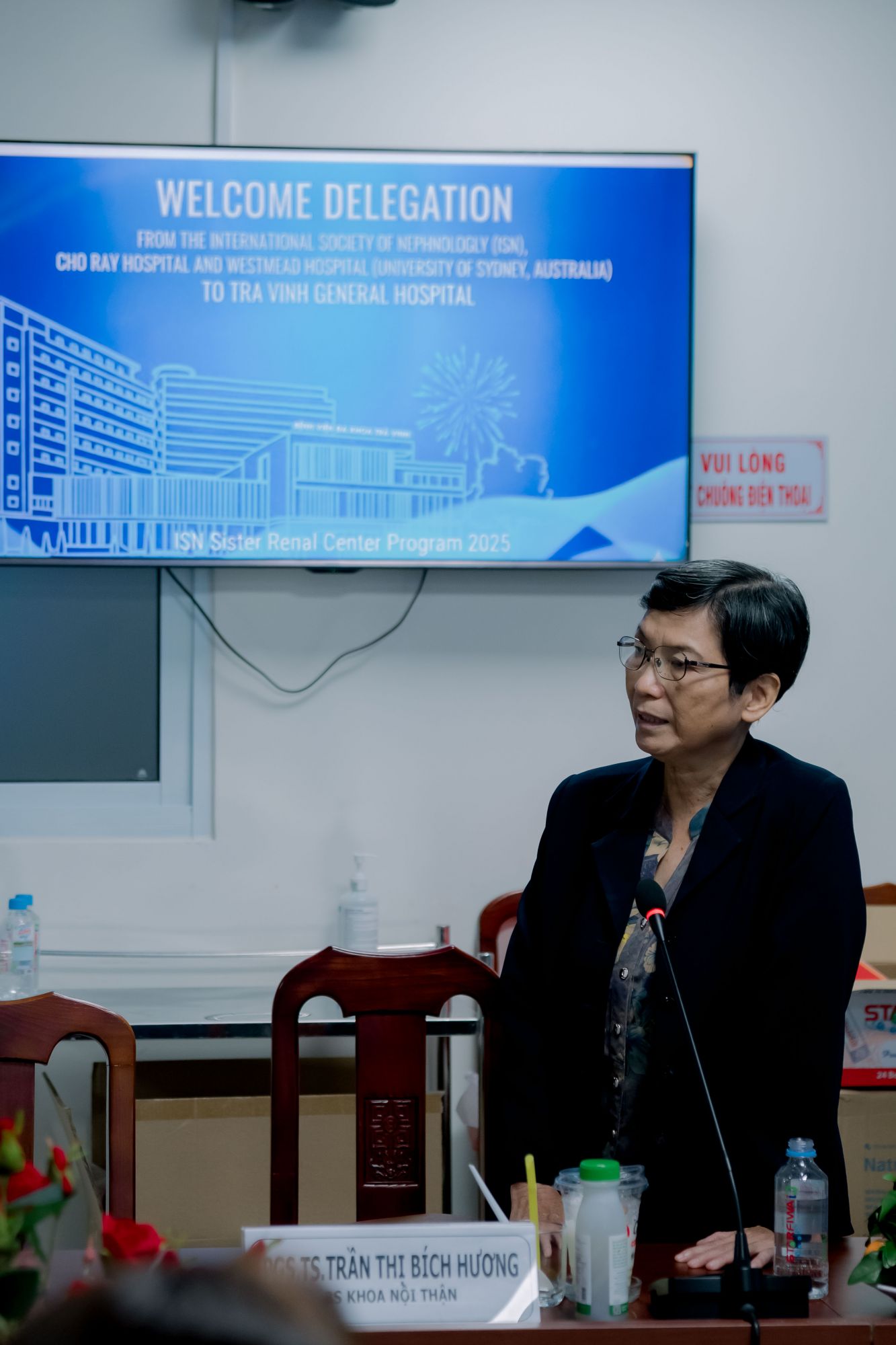 PGS.TS. Trần Thị Bích Hương trình bày dự thảo chương trình hợp tác giai đoạn 2026–2027 giữa ba đơn vị (Trà Vinh – Chợ Rẫy – Westmead), với trọng tâm là tăng cường năng lực chẩn đoán, điều trị sớm tổn thương thận cấp và nâng cao trình độ chuyên môn cho đội ngũ y bác sĩ, điều dưỡng.