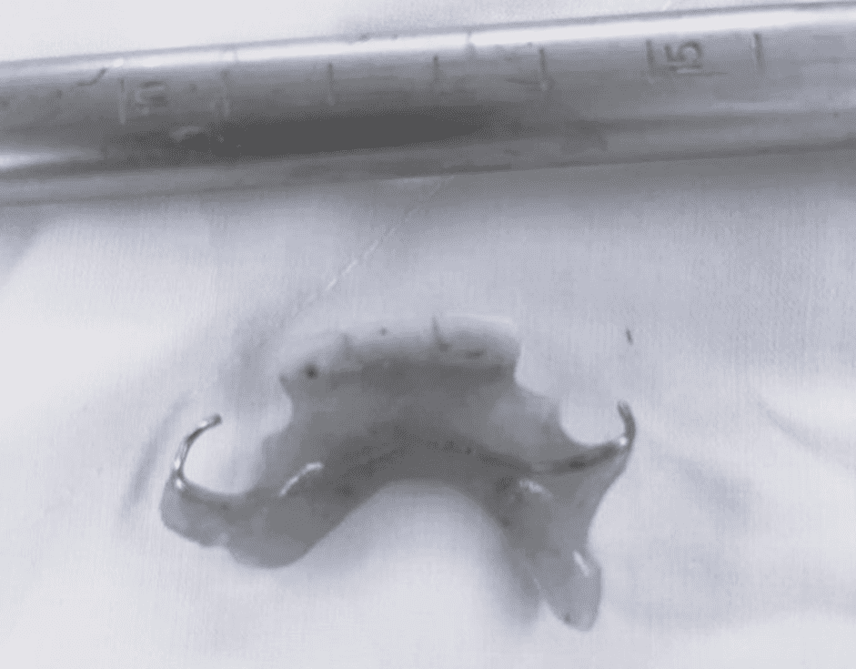 Với sự phối hợp nhịp nhàng của đội ngũ y bác sĩ, dị vật là hàm răng giả có móc sắc nhọn đã được lấy ra thành công sau khi thực hiện thủ thuật soi thực quản ống cứng.