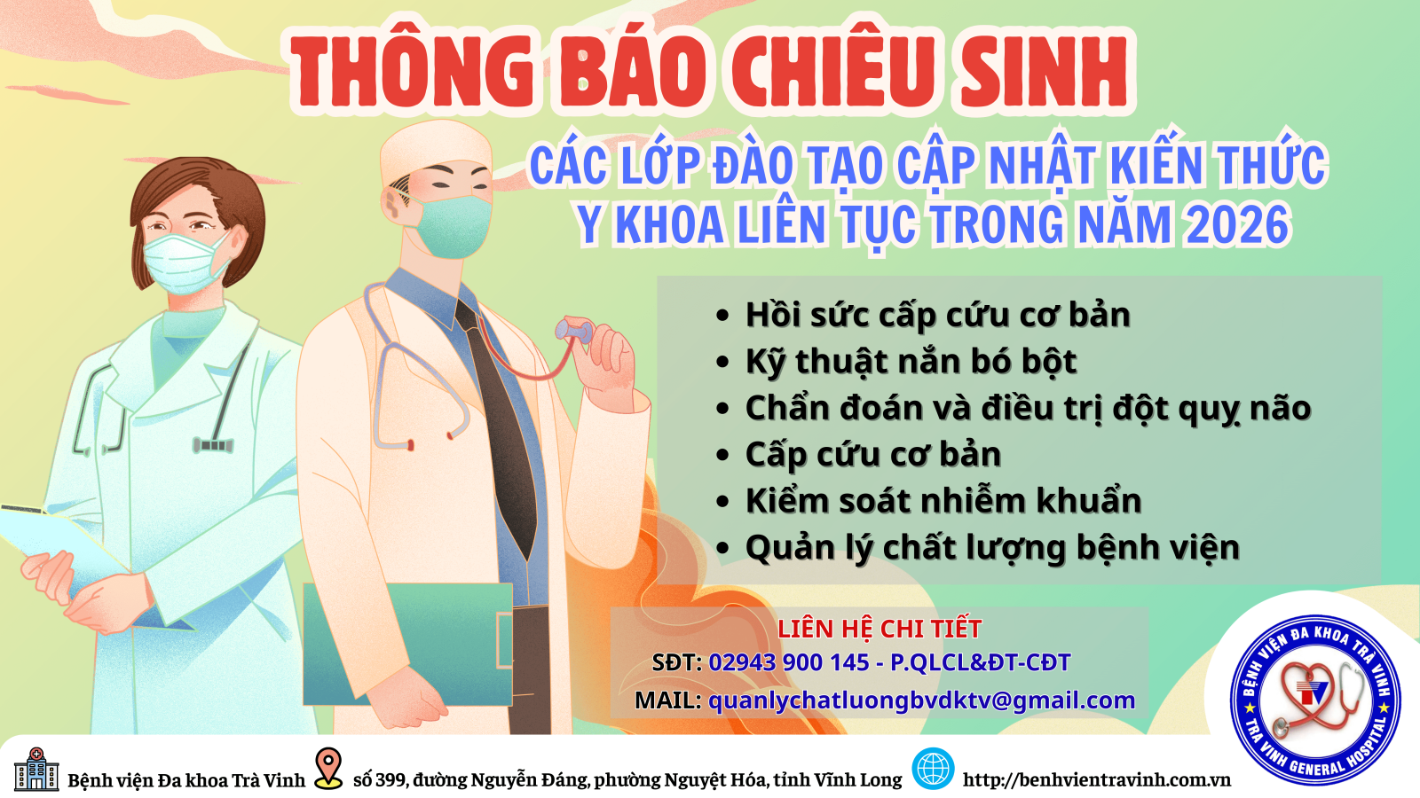 Bệnh viện Đa khoa Trà Vinh thông báo chiêu sinh khai giảng các khoá đào tạo, cụ thể như sau: